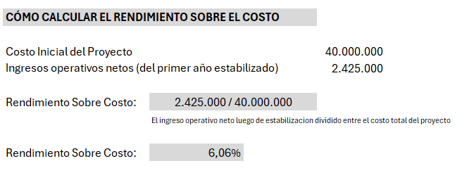 “El rendimiento sobre el costo es el ingreso operativo neto (o, a veces, el flujo de efectivo de las operaciones) en la estabilización dividido por el costo total del proyecto, mientras que la tasa de capitalización (tasa de capitalización) es el ingreso operativo neto estabilizado (o, a veces, el flujo de efectivo de las operaciones) dividido por el valor de mercado de la propiedad.”