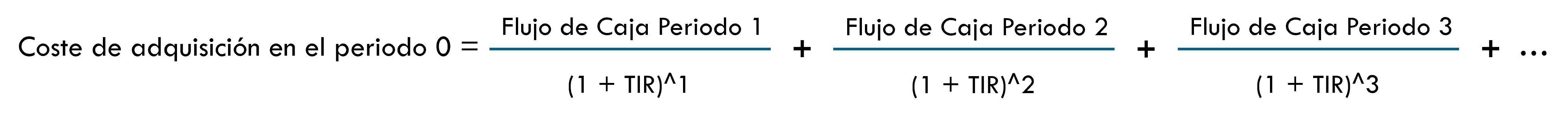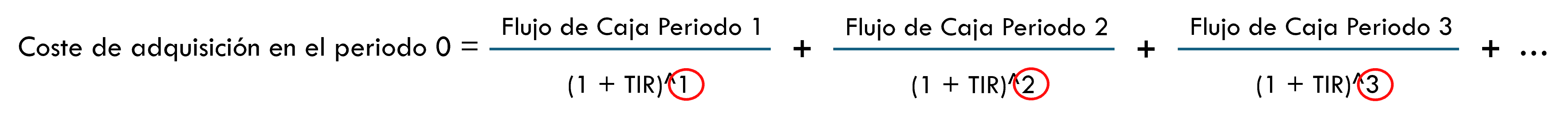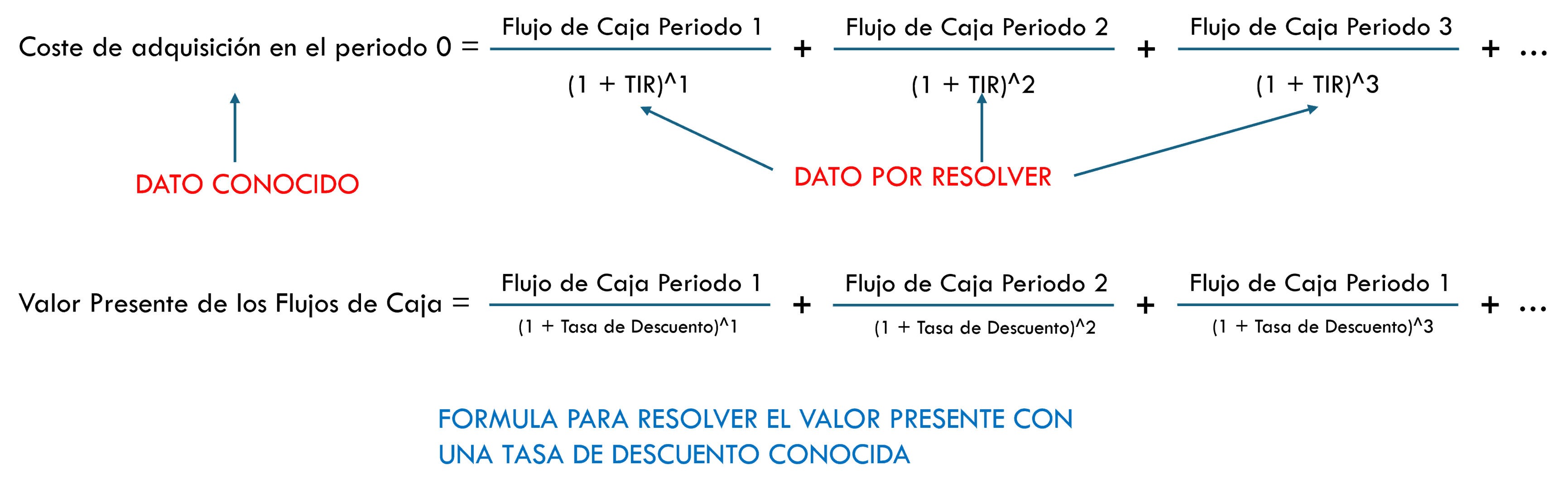 Recordatorio: La fórmula de la TIR es la fórmula del valor actual, sólo que, en lugar de resolver el valor actual, conocemos el valor actual y resolvemos la tasa de descuento (la TIR).