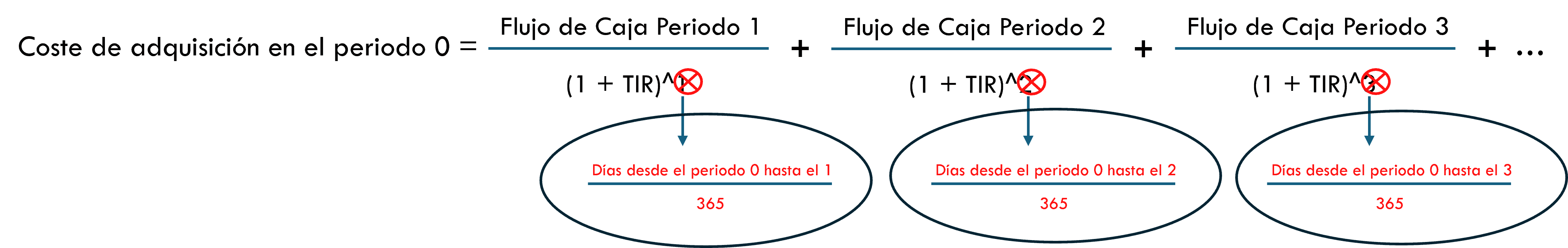 Así que la pregunta es, ¿cómo alteramos la fórmula para que cuando haya pagos en diferentes intervalos de tiempo distintos de un año pueda resolver correctamente la tasa interna de rendimiento? La respuesta es que modificamos el exponente, que en la fórmula normal de la TIR siempre es proporcional al año del periodo de referencia y determina cómo se descuenta el efectivo.