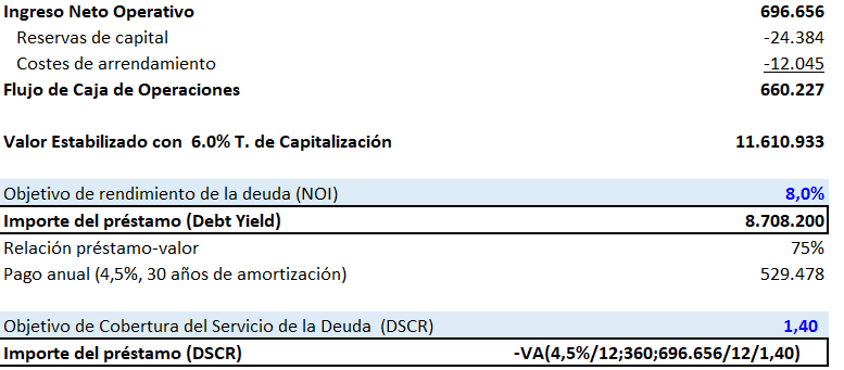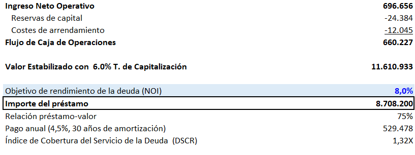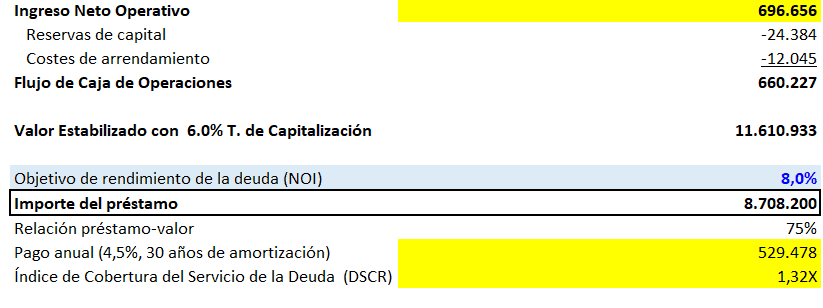 A continuación, basándose en el tipo de interés y el plazo del préstamo (4,5% y 30 años), se calcula el importe máximo del préstamo que corresponde a estos servicios mensuales de la deuda y de este modo se obtiene el importe del préstamo que mantiene el DSCR objetivo, en Excel podemos utilizar la fórmula de Valor Actual = VA() = (Tasa Mensual; Periodo en Meses; Pagos basados en DSCR Objetivo)