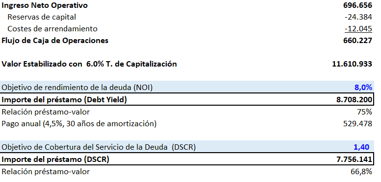 Tenga en cuenta que puede mostrar una propiedad a cinco prestamistas diferentes, pedirles que le proporcionen los “ingresos máximos” y obtendrá cinco importes de préstamo diferentes. Esto se debe a que cada uno de ellos tendrá sus propias hipótesis sobre el NOI y el rendimiento de la deuda, con lo que cada uno llegará a su propio importe de préstamo correcto, es decir; Importe del préstamo = 696.656 / 0,08