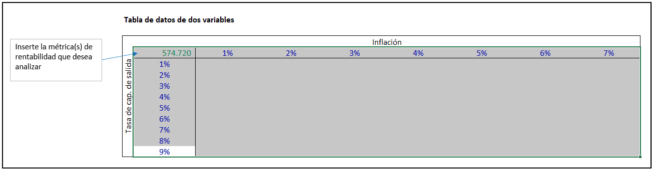 En la plantilla de este artículo, podemos elegir entre cuatro variables: el precio de compra, la inflación, el año de salida y la tasa de capitalización de salida. Para este ejemplo, vamos a elegir la inflación y la tasa de capitalización de salida.