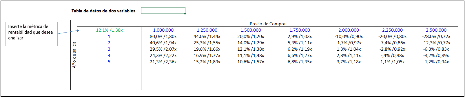 El azul es la TIR y el rojo el múltiplo de capital.