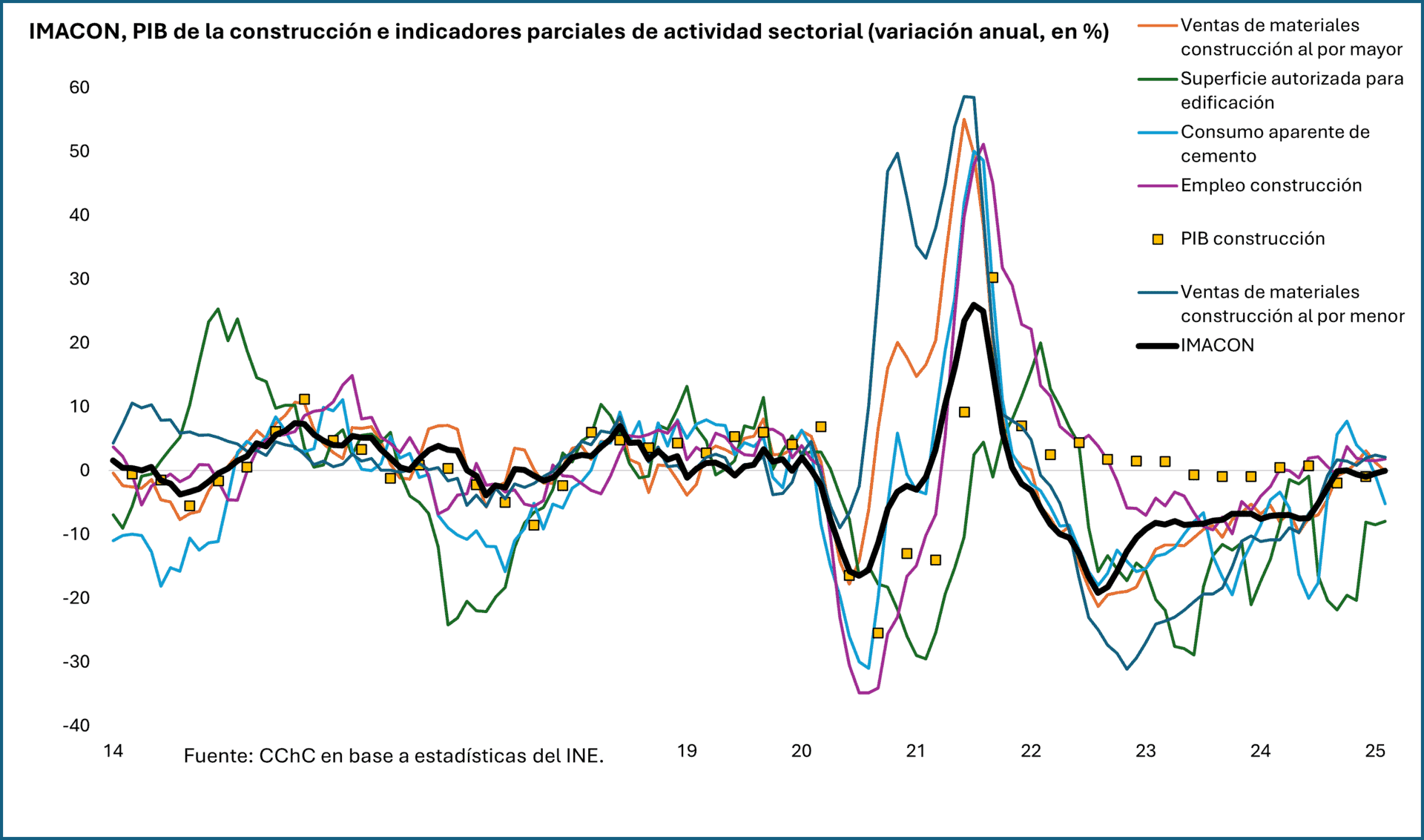 Gráfica: IMACON, PIB de la construcción e indicadores parciales de actividad sectorial (variación anual, en %)
