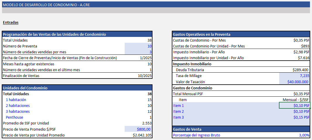 - Utiliza nuestro modelo de desarrollo de condominios para estimar los flujos de caja del proyecto completo, incluyendo ventas, costos de construcción, financiamiento, y calendario de ejecución.