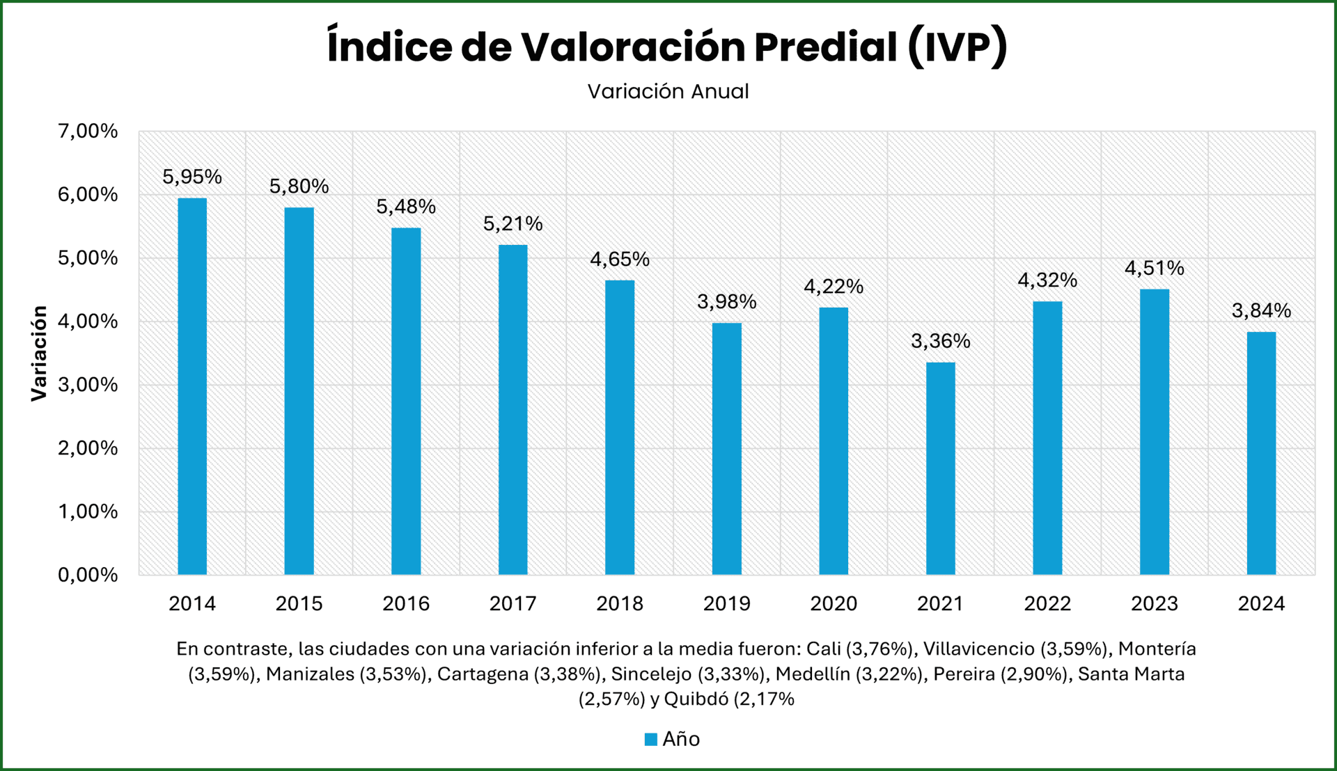 Según el boletín técnico del DANE, en 2022, el IVP registró una variación anual del 4,31% a nivel nacional, evidenciando una aceleración en el incremento de los valores prediales en comparación con el 3,36% reportado en 2021. Este comportamiento sugiere una tendencia al alza en los precios de los inmuebles residenciales en las principales ciudades del país.