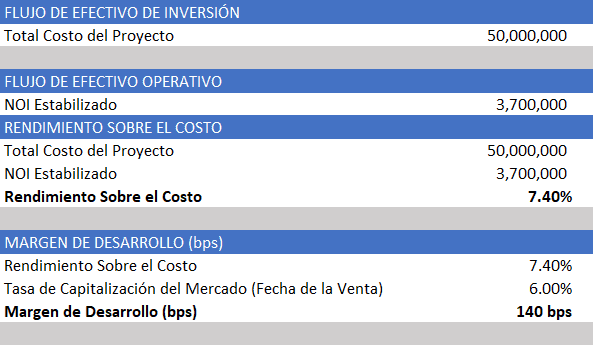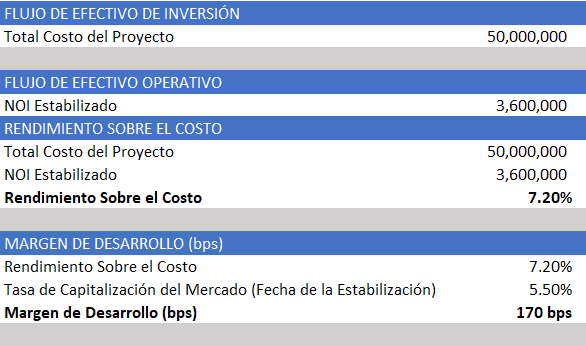 Margen de Desarrollo = Rendimiento sobre el costo “Estabilizado sin proyección” – Tasa de Capitalización del Mercado (Hoy)