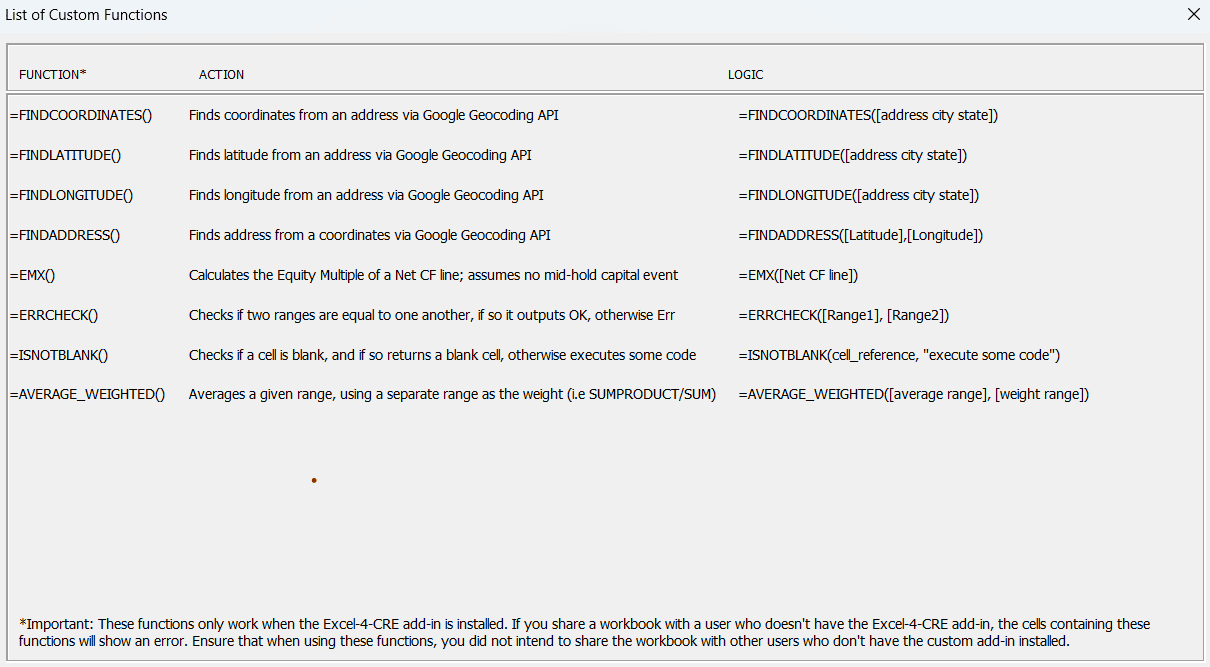 Este complemento incluye varias funciones personalizadas específicas del complemento (por ejemplo, las funciones específicas de Geocodificación) y útiles para la modelización financiera inmobiliaria.