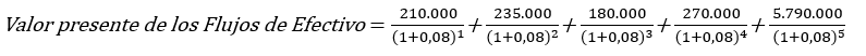 Para resolverlo de manera matemática considerando períodos anuales, se aplica esta fórmula al flujo de caja proyectado: