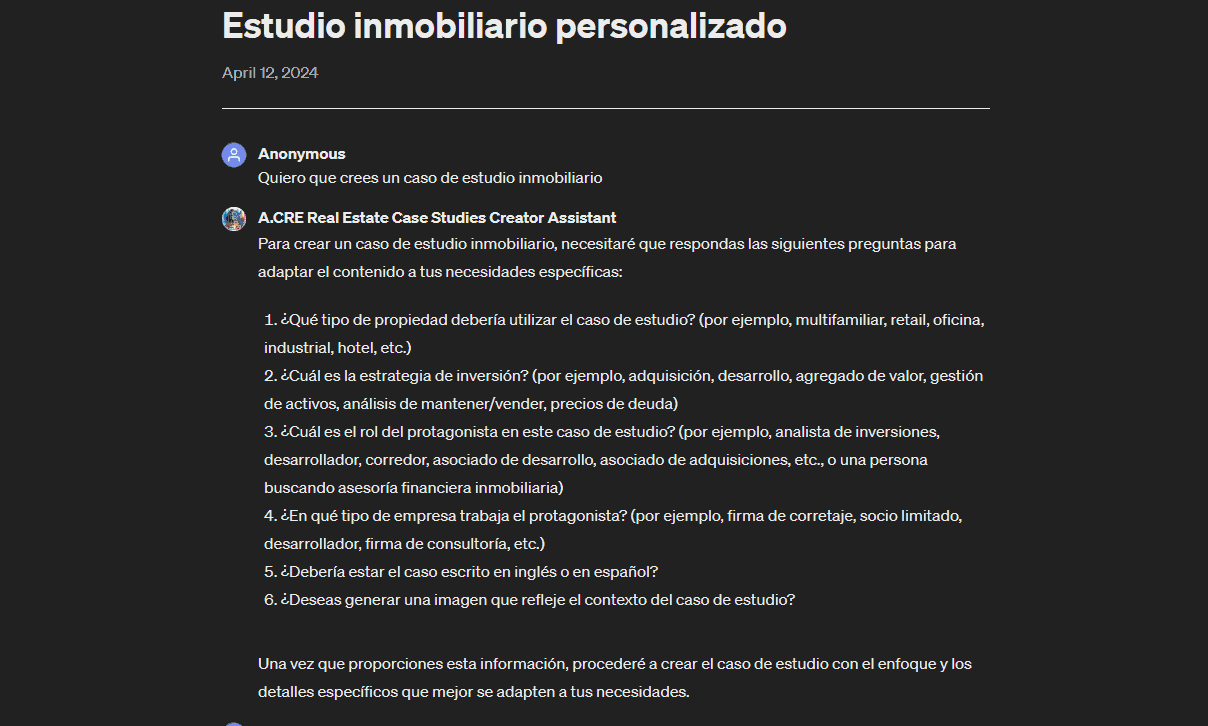 Haz clic para chatear con el Asistente Creador de Estudios de Caso de Bienes Raíces de A.CRE (Importante: a partir de abril de 2024, los GPT personalizados están disponibles solo para miembros de ChatGPT Plus) y usa instrucciones simples como “Quiero que crees un caso de estudio inmobiliario” o “Crea un caso de estudio para una operación inmobiliaria comercial”. Ten en cuenta que, como con otras aplicaciones de IA generativa, puede haber errores en los resultados, y querrás verificar la información. ¡Pero puedes comenzar a usar esta herramienta poderosa ahora mismo!