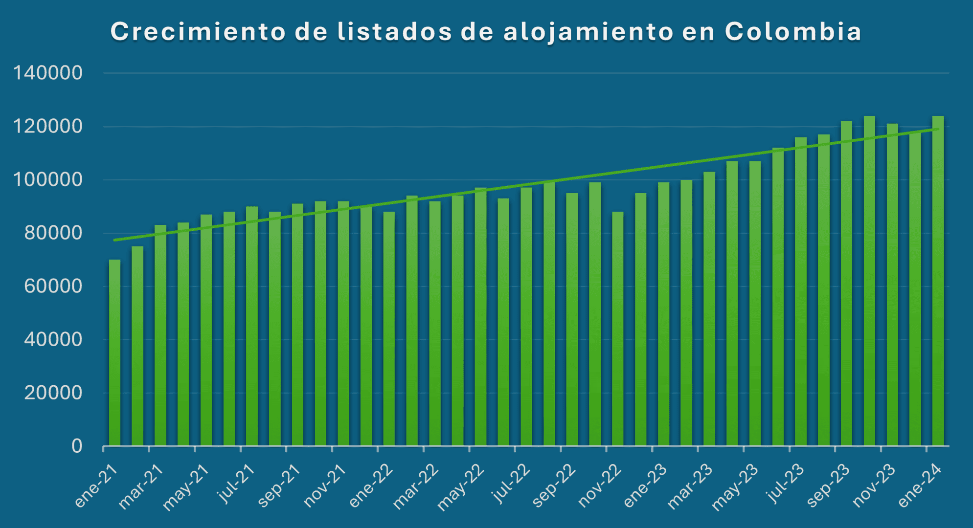 El sector del alojamiento en Colombia ha experimentado un notable crecimiento en los últimos tiempos, con un asombroso aumento del 29% en los listados sólo en el último año. Este aumento del número de alojamientos indica una fuerte recuperación.