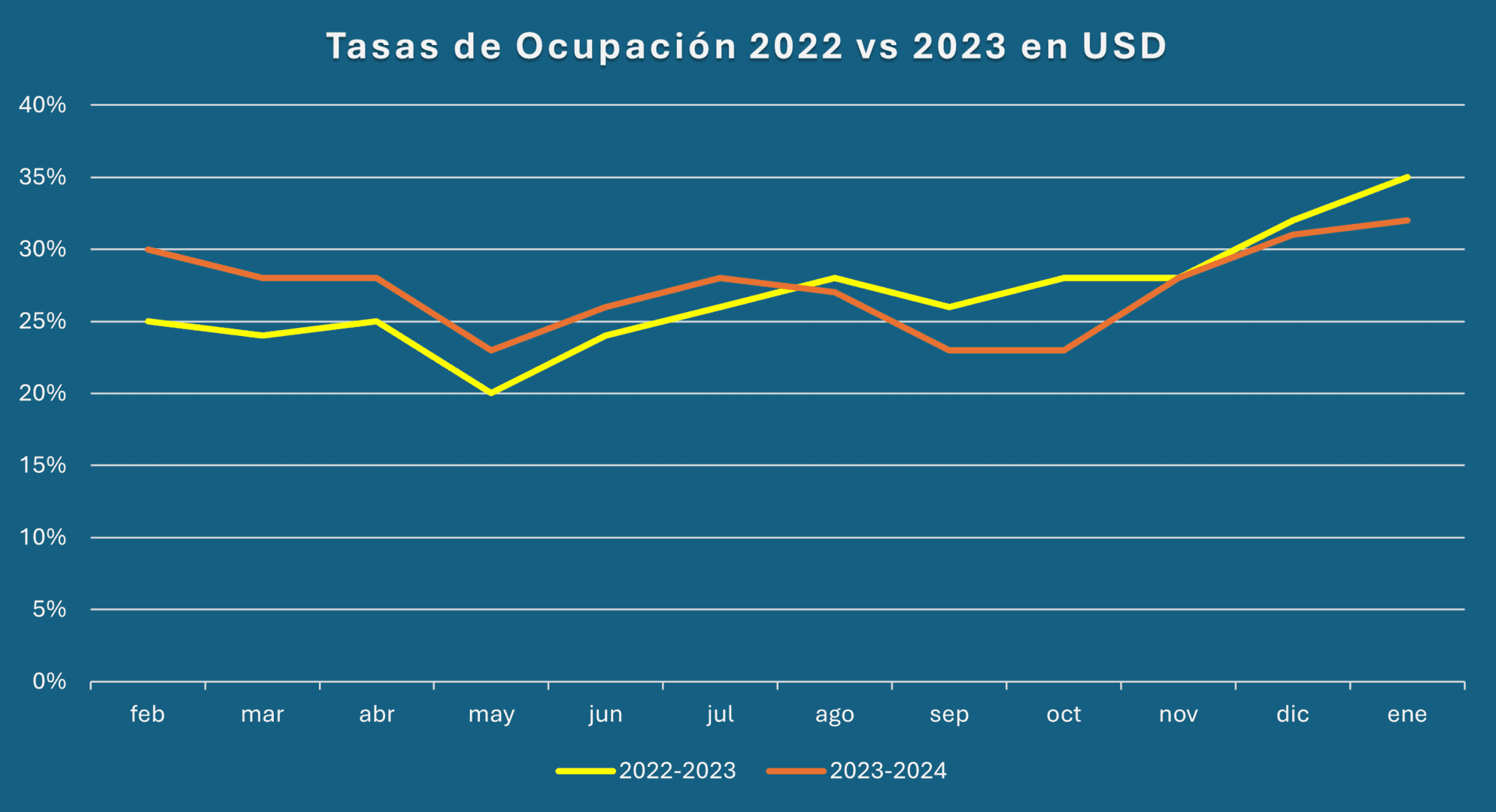 - La tasa de ocupación alcanzó su máximo con un 35% en enero de 2023, mientras que la tasa más baja fue del 14% en mayo de 2021.