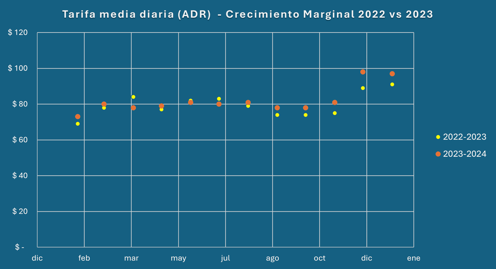 - En general, la tarifa media diaria (ADR) más baja fue de 66 USD en febrero de 2021 y alcanzó un máximo de 91 USD en enero de 2023.