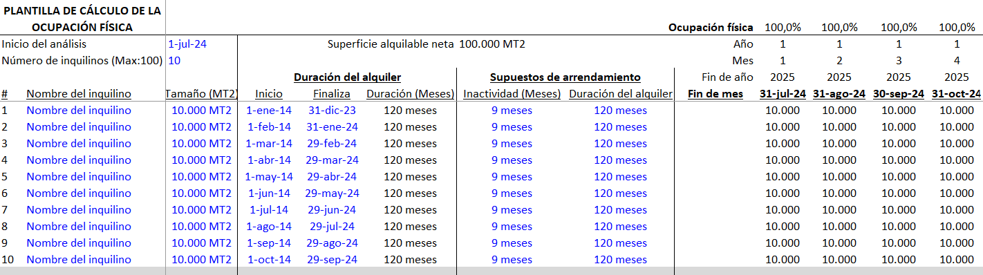 El modelo permite un máximo de 100 inquilinos y un periodo de análisis de hasta 360 meses. Necesitará una lista actual de alquileres con las fechas de inicio y finalización de los contratos, así como una idea de los periodos de inactividad del mercado y de la duración de los contratos. Sólo tiene que introducir el nombre de cada inquilino, el tamaño de su espacio, la fecha de inicio y finalización de su contrato de arrendamiento, y las hipótesis de tiempo de inactividad y duración del contrato de arrendamiento del mercado para cada inquilino, y el Libro de Trabajo modelará el porcentaje de ocupación física para cada mes de su período de análisis.