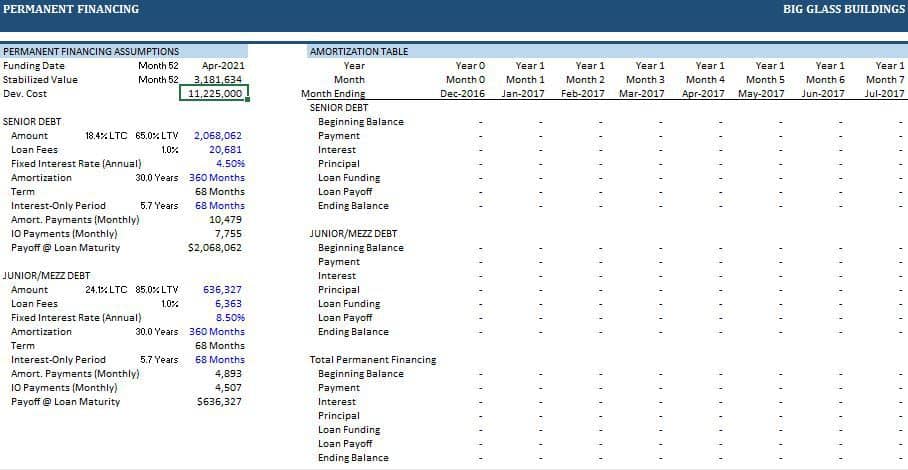 In addition to loan-to-value, other outputs on this tab include a detailed amortization schedule for both the senior and secondary loans, loan-to-cost for the senior and the combined loans, amortization and interest-only monthly payments, loan payoff at maturity, among others.