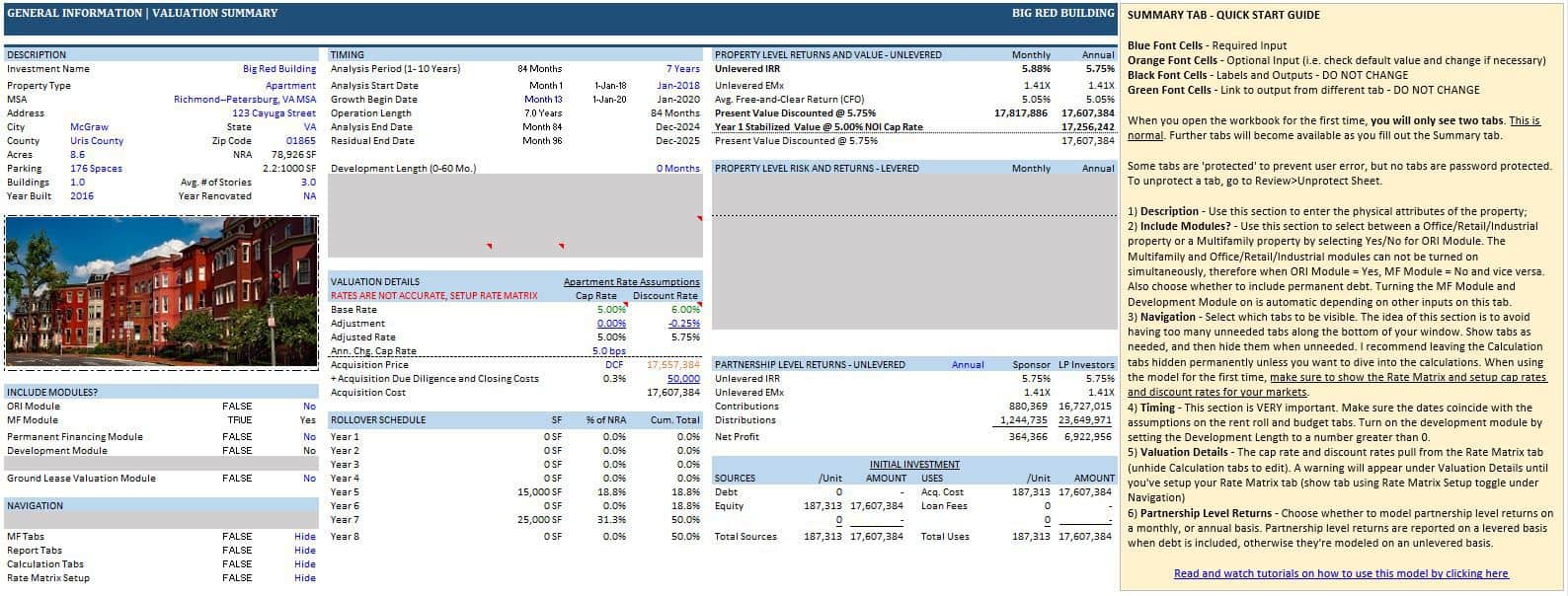 When you open the model, you’ll begin at the ‘Summary’ page. In this tab, you’ll drop in the physical attributes of the property, choose whether to use or not use various modules, enter the project timing and analysis period, and input your valuation assumptions. The summary tab reports a few key risk and return metrics including annual rollover, debt coverage, debt yield, internal rate of return, equity multiple, average cash-on-cash return, among others. The summary page also includes a basic sources and uses table.