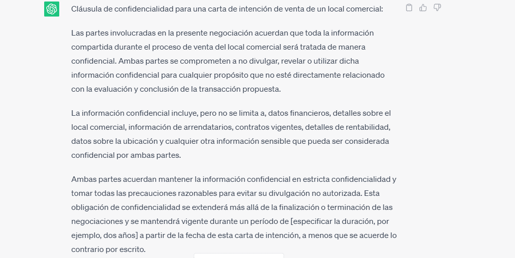 La salida creada desde ChatGPT basada en el prompt: “Redacta una cláusula para una carta de intención que requiere al comprador y vendedor de un local comercial mantener toda la información compartida de manera confidencial.”.