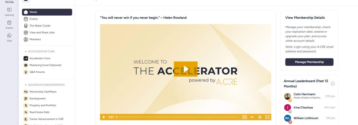 In 2018, Michael and I designed and built the A.CRE Accelerator program. Our goal was to create the preeminent tool for mastering real estate financial modeling—a program that would provide a clear path to expertise and give Accelerator Graduates a significant edge in the industry.