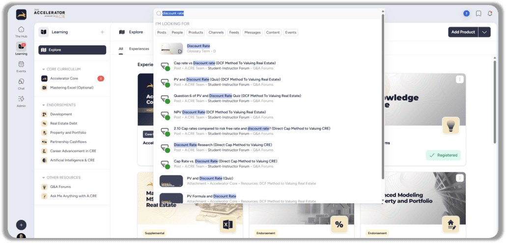 With Accelerator 3.0, virtually every concept related to modeling direct investments in real estate is covered, whether in the Core Curriculum or one of the Specialty Endorsements. Additionally, new features like community networking and live Events provide opportunities to connect with others, ask questions, and engage in collaborative learning.