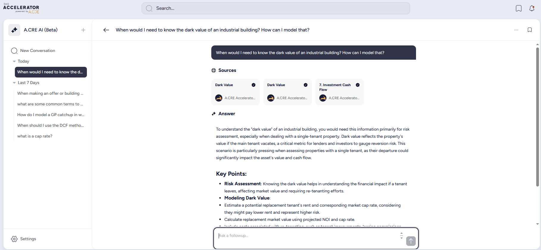 While the A.CRE AI (Beta) has the full Accelerator knowledge base at its fingertips, today’s AI technology just isn’t great at pulling in the right details with the same nuance or emphasis that a human would. In our testing, we found that in the great majority of cases this AI Tutor was factually accurate, even if it highlighted less relevant points or missed key takeaways that the A.CRE team would have prioritized in our response to the same question.