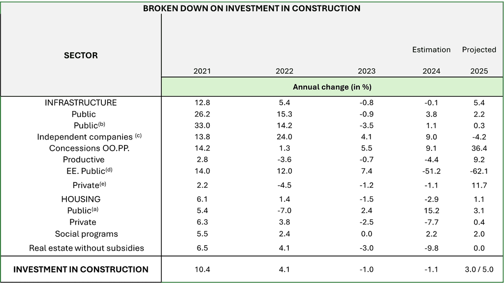 Despite these challenges, investment in housing is expected to grow by 1.1% in 2025, with a 3.1% increase in Public Housing and a slight increase of 0.4% in Private Housing, although it would still remain below historical levels.