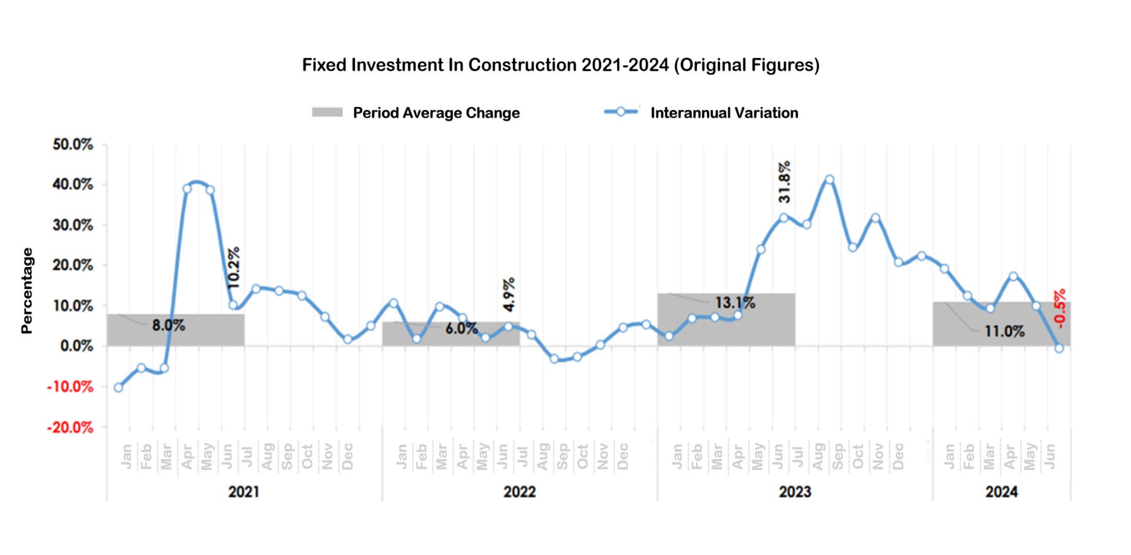 In contrast, the January–June 2024 period showed signs of recovery, with investment increasing by approximately 11% in real terms. Despite this rebound, July 2024 registered a 0.9% month-over-month decline in production value, reflecting ongoing volatility in construction activity.