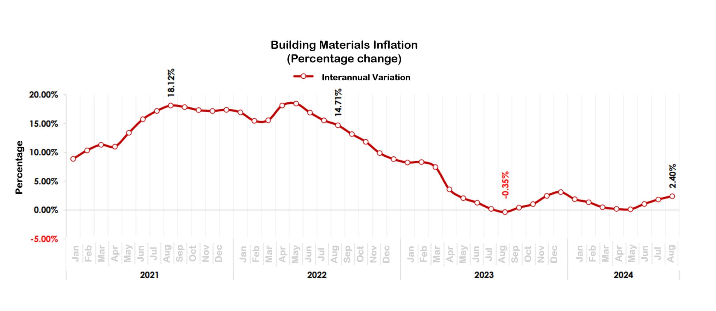 The construction industry in Mexico has undergone notable fluctuations throughout 2023 and 2024. In the first quarter of 2023, construction investment by companies rebounded with a real growth of 21.0% compared to the same period in 2022. However, toward the end of 2023, the sector faced a decline, averaging a monthly contraction of around 10%, culminating in a 0.5% annual drop.