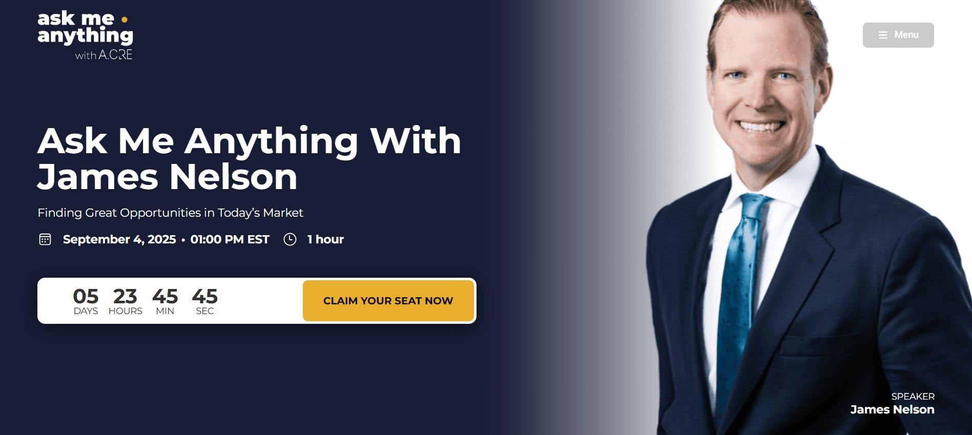 We are thrilled to announce our next A.CRE Ask-Me-Anything (AMA) session featuring James Nelson, a nationally recognized real estate investor, educator, and Principal at Avison Young, where he leads the firm’s U.S. Investment Sales practice in New York City.