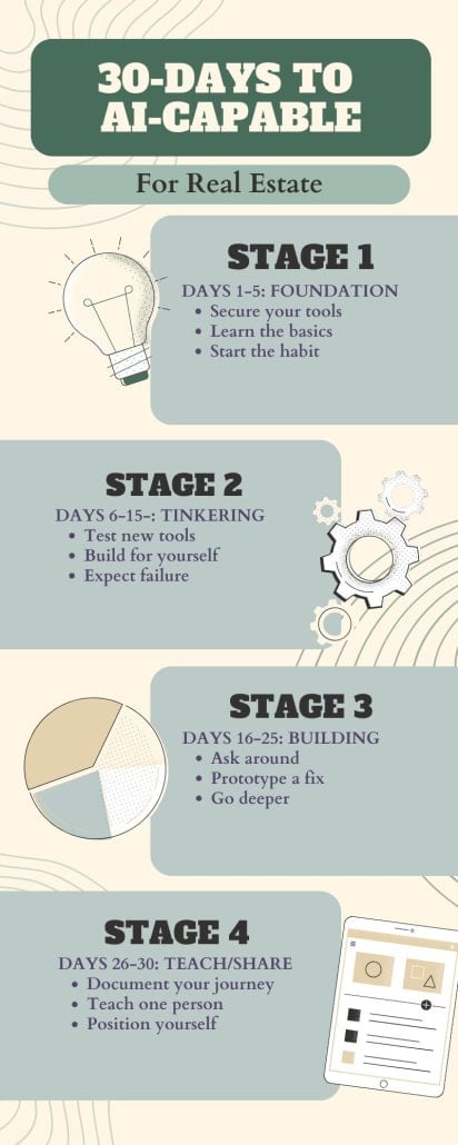 The key: small daily experiments that build compound knowledge. So, let’s walk through a four-stage, 30-day plan to becoming AI-capable – the first step toward becoming AI-native.